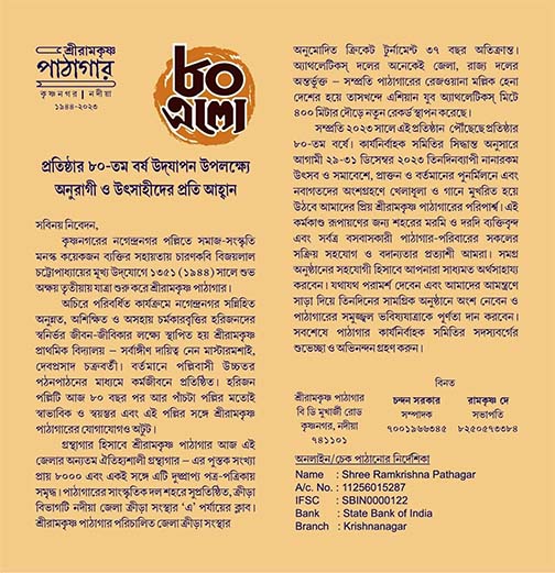 ৩১ ডিসেম্বর সকালে ছিল নগেন্দ্রনগর ইউনাইটেড রেড স্টারস ক্লাব মাঠে প্রাক্তনদের প্রীতি ক্রিকেট খেলা। পাঠাগারের সঙ্গে গভীরভাবে জড়িয়ে থাকা বাচিকশিল্পী আকাশ লিখছে, — “পাঠাগারের ৮০ বছর…দেশ স্বাধীন হল…দেশভাগ হল…দাঙ্গা হল…পাঠাগারের ৮০ বছর…গান্ধী হত্যা…খাদ্য-আন্দোলন…পাঠাগারের ৮০ বছর…একাত্তরের মুক্তিযুদ্ধ…নকশাল আন্দোলন…পাঠাগারের ৮০ বছর…কবি বিজয়লাল কোদাল আর ঝুড়ি নিয়ে হেঁটে যাচ্ছেন হরিজন পল্লীর দিকে। …তাঁর সঙ্গ নিলেন মাস্টারমশায়…সুধীরবাবু তখন তরুণ অধ্যাপক…পাঠাগারের ৮০ বছর…আমি যখন মা’র সঙ্গে পাঠাগারে গেলাম তখন আমার বয়স চার…আবৃত্তি প্রতিযোগিতা…প্রথম হলাম…পুরস্কার আনতে গিয়ে দেখি নাটক হচ্ছে…মা বলল চুপ করে শোন, এ হল “তাসের দেশ”…পাঠাগারের ৮০ বছর…রাজপুত্র আর সওদাগরপুত্র দেশ থেকে দেশান্তরে চলে গেল তারপর…আর একবার প্রতিযোগিতায় পাঠাগারে গিয়ে,জারুলগাছটার নীচে দাঁড়িয়ে বাবা বলেছিলে জানিস, এই এখান থেকে একদিন নদী দেখা যেত…আমাদের খোড়েনদী…রুপোর মত বালি চিকটিক করতো রোদ্দুরে আর জ্যোৎস্নায়…পাঠাগারের ৮০ বছর…”