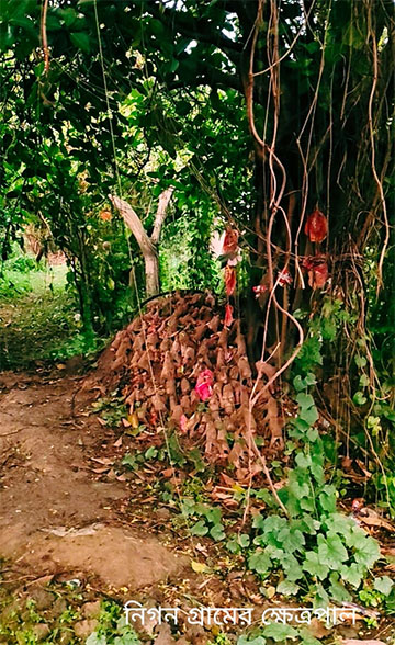 বাংলার পঞ্চানন্দ যে দ্রাবিড় দেবতা শিবের সমতূল্য ছিলেন সন্দেহ নেই। কিন্তু অনার্য দেবতা বলে তার ঠাঁই হল নিচে। যেমনটা হয়েছিল দেবী মনসা শীতলা চণ্ডীর। জনপ্রিয়তার জোরে দেবী মনসা চণ্ডী বর্ণ হিন্দুর পূজা আদায় করেন কিন্তু অপদেবতার অপবাদ নিয়ে বহুকাল দূরেই থাকতে হল পঞ্চানন্দকে। কিন্তু ভক্ত ভক্তি ও ভয় কম ছিল না। তাই গ্রামের প্রান্তে হলেও তার আসন টলেনি কখনও। এমনই পঞ্চানন্দ ক্ষেত্রপাল হয়ে আছেন মঙ্গলকোটের নিগন গ্রামে। বৈশাখের প্রথম দিনে তার পূজা। দেয়াশী মালাকার সম্প্রদায়ের। তার পূজার আয়োজনে জমির নানান বন্দোবস্ত শুনে মনে হল একদা তিনিই ছিলেন গ্রামের মূখ্য দেবতার আসনে। কিন্তু বর্ণ হিন্দুর দেবতা শিবের আগমনে আসনচ্যুত হন তিনি। তাই হয়ত তার আসনের অদূরেই ঐ গ্রামের শিবতলা। যাইহোক তাকে ঘিরে রহস্যের শেষ নেই। সেই রহস্য ও পূজা মানত’এর কথা শোনালেন ঐ গ্রামের অজয় ও কিরীটী মণ্ডল। ভক্তের প্রার্থনা মঞ্জুর হলেই জ্যান্ত শোল মাছের নৈবেদ্য গ্রহন করেন তিনি। সকালে ভক্ত দেখে মাছের কাঁটা টুকু পড়ে আছে। অন্যথা হলে জ্যান্ত মাছ জ্যান্ত পড়ে থাকে। পিঁপড়ে পর্যন্ত স্পর্শ করে না। পূজারীর দেখা না মেলায় মন্ত্র তন্ত্র জানা হয়নি তবে পূজার নিয়ম অদ্ভুত। নিশি রাতে পূজার পর ব্রাহ্মণ এমনকি ঢাকীদেরও পিছনে ফিরে তাকানো নিষিদ্ধ। তার ভয় এমনই যে গ্রামের মাঝেও পূজাতলা নির্জন নিঝুম।