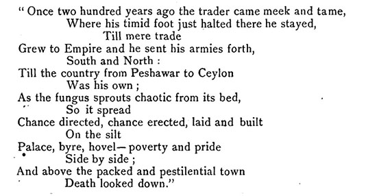 “একদা দুশো বছর আগে বণিক এসেছিল শান্ত ও নিরীহ বেশে, যেখানে তার ভীতু পা থেমেছিল সেখানেই সে রয়ে গেল, যতক্ষণ না নিছক বাণিজ্য সাম্রাজ্যে পরিণত হলো এবং সে তার সেনাবাহিনী পাঠাল, দক্ষিণে ও উত্তরে: যতক্ষণ না পেশোয়ার থেকে সিলন পর্যন্ত দেশটি তার নিজের হলো; যেমন ছত্রাক বিশৃঙ্খলভাবে তার শয্যা থেকে অঙ্কুরিত হয়, তেমনই এটি ছড়িয়ে পড়ল, সুযোগ দ্বারা পরিচালিত, সুযোগ দ্বারা নির্মিত, পলিমাটির উপর স্থাপিত ও গড়া প্রাসাদ, গোয়ালঘর, কুঁড়েঘর—দারিদ্র্য ও অহংকার পাশাপাশি; এবং জনাকীর্ণ ও রোগাক্রান্ত শহরের উপর থেকে মৃত্যু নিচে তাকিয়ে রইল।”
