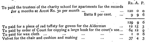 রেভারেন্ড জে.[জেমস] লং, ‘সিলেকশনস ফ্রম দি আনপাবলিশড রেকর্ডস অফ গভর্নমেন্ট, ১৭৪৮-৬৭’ বই-এর ভূমিকায় আমাদের জানিয়েছেন, মেয়র আদালতের নথি হাইকোর্টের মহাফেজখানায় সংরক্ষিত আছে, কিন্তু দুর্ভাগ্য, ১৭৪৯-এর পরের সমস্ত নথি হারিয়ে গেছে। রেভারেন্ড জ্রমস লং ১৭৫৩-র মেয়র আদালতের খরচের নিম্নলিখিত বিবরণ দিয়েছেন :