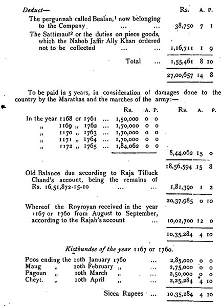 ১৬ ডিসেম্বর বর্ধমানের আইনজীবী রাজচন্দ্র রায় প্রেসিডেন্সিতে আসেন এবং দুই দিন পরে হিসাব পরিষদের সামনে উপস্থাপন করা হয়। রাজার ভবিষ্যতের অর্থ প্রদানগুলো নিম্নলিখিতভাবে নিষ্পত্তি করা হয়েছিল: (Long: Selections, No. 487)